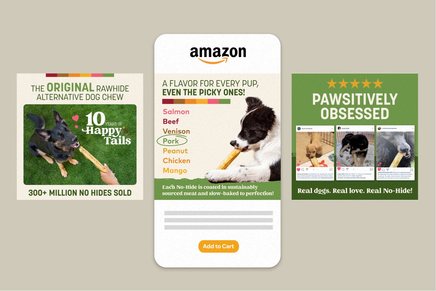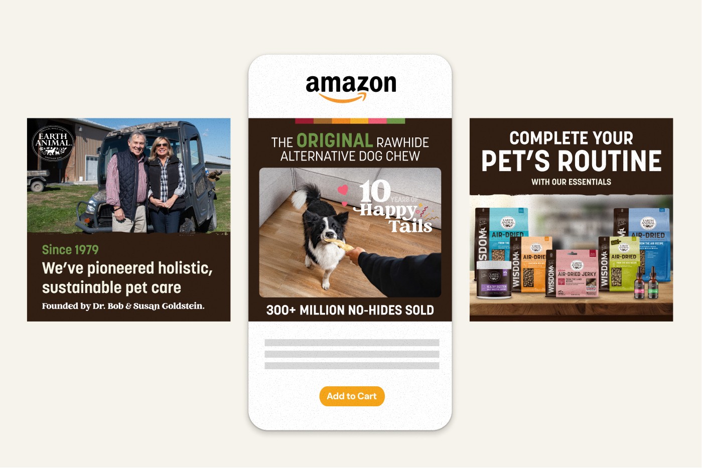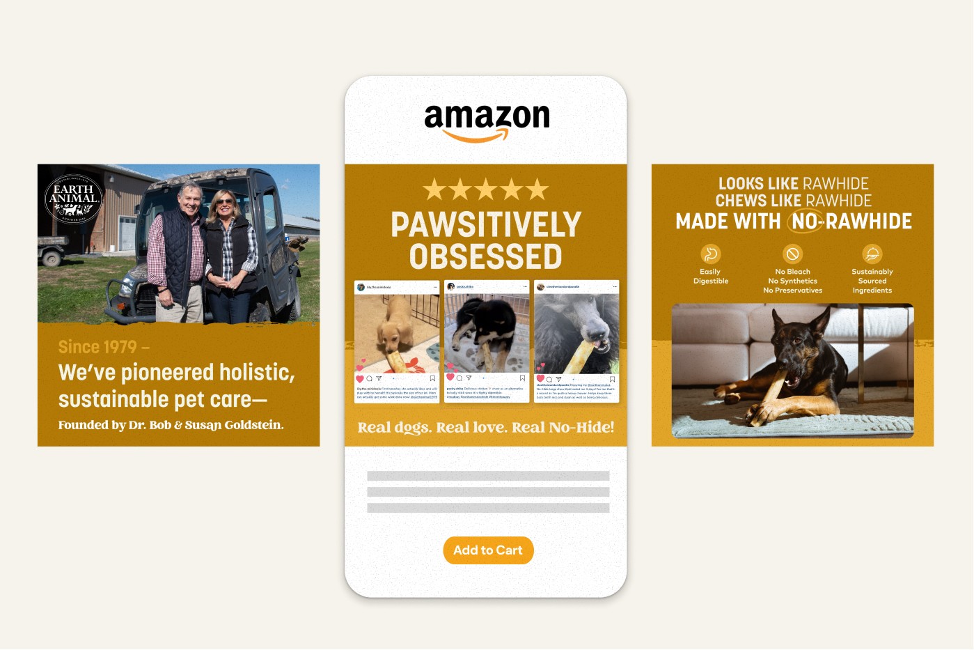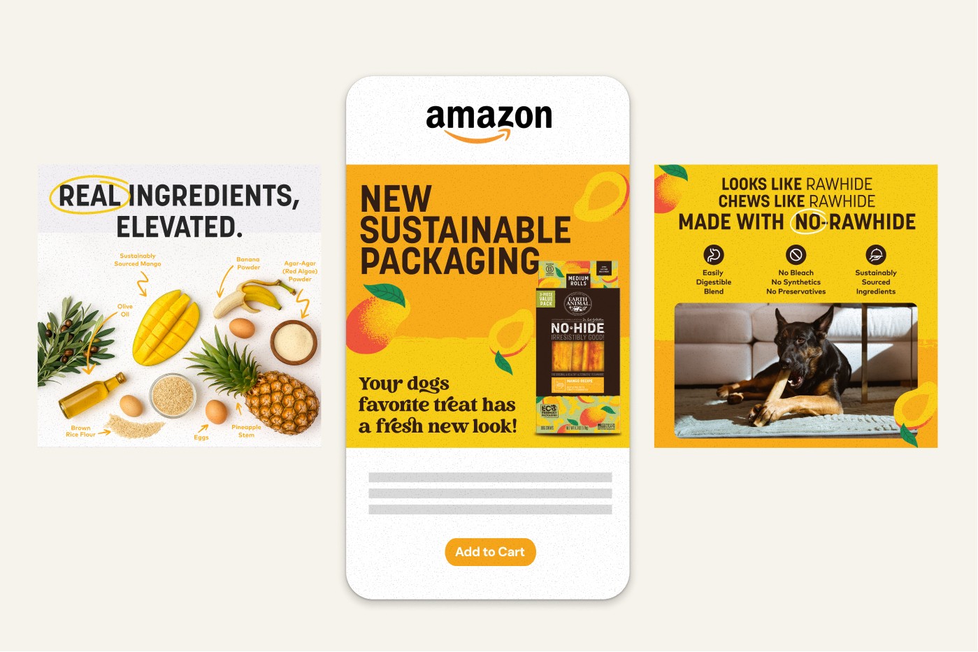 Created concept and digital assets for Earth Animal's Amazon page. Including image stacks for multiple flavors + sizes, A+ Content, and Amazon Storefront Design.