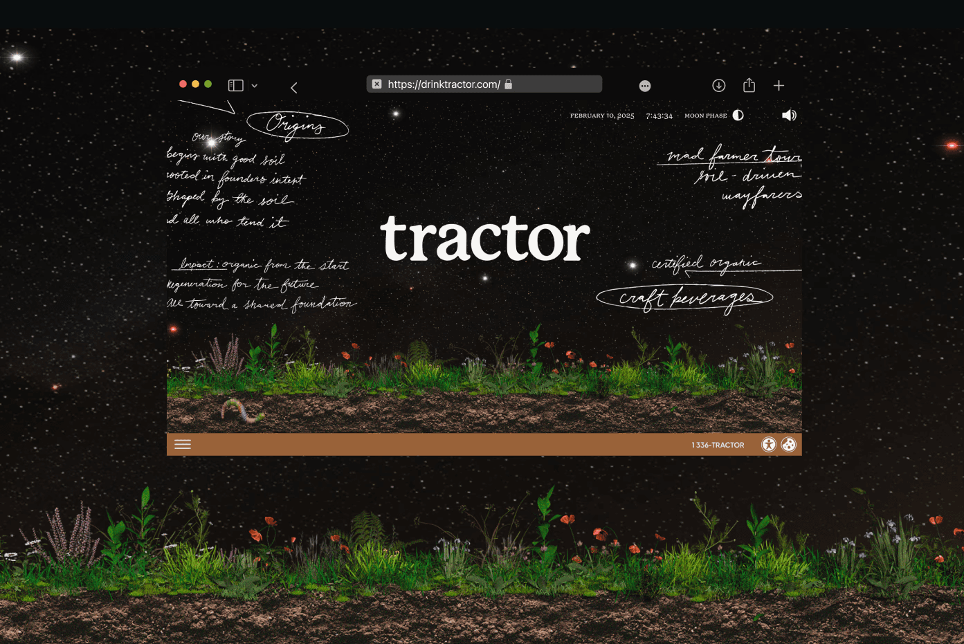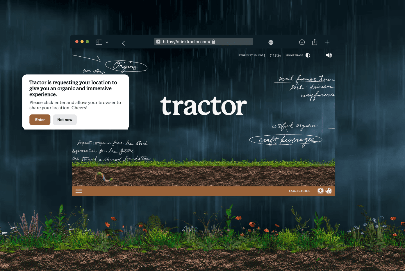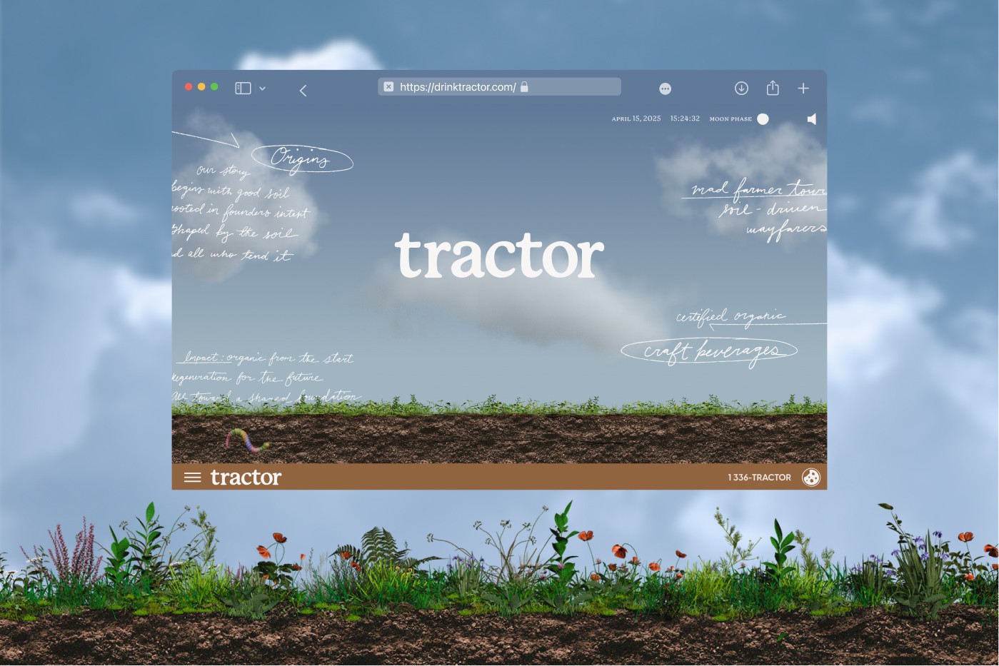 Art Directon, design, and development for Tractor's custom designed Framer site. Site utlizes user-location for a custom immersive experience with weather, seasons, and music.